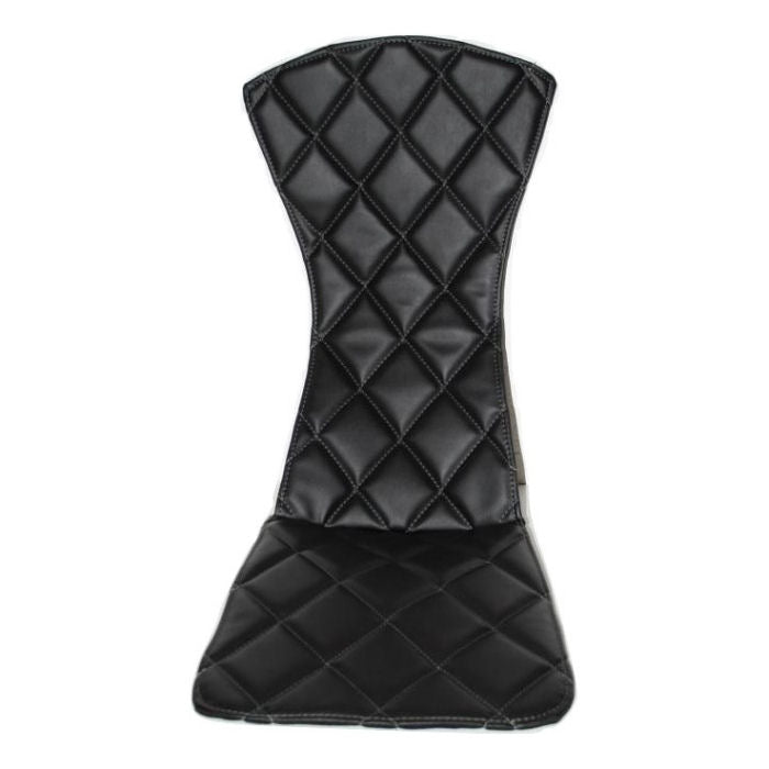 This padded seat cover is black vinyl material with grey stitching